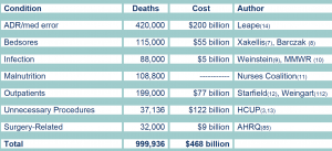 Using Leape’s 1997 medical and drug error rate of 3 million(14) multiplied by the 14% fatality rate he used in 1994(16) produces an annual death rate of 420,000 for drug errors and medical errors combined. Using this number instead of Lazorou’s 106,000 drug errors and the Institute of Medicine ‘s (IOM) estimated 98,000 annual medical errors would add another 216,000 deaths, for a total of 999,936 deaths annually.