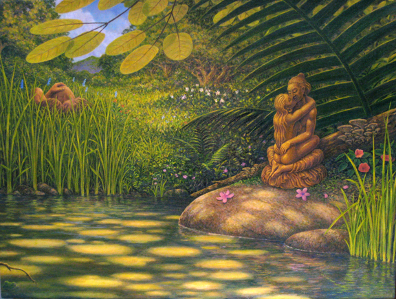 The Sanskrit word Karmamudra is a technical term utilized in Tibetan Buddhism, specifically in Tantra. The term is derived from karman (act) and mudra (seal), so can be translated as “action seal” or “activity seal.” It refers to a secret level of Tantra in which specially prepared initiates – one male, one female – join sexually in order to harness the power of sex for spiritual development. Through the “activity” of sexual energy, the initiate can “seal” their consciousness in the clear light (bodhichitta / Chenresig / Christ). Karmamudra refers both to this type of practice and sometimes to the woman who practices it.