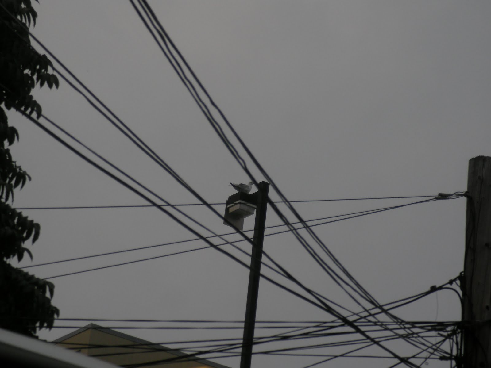 Reading d Book, Fussell’s POETIC METER AND POETIC FORM, I look up thru d Moonbean Cafe Window, thru a tangle of Phone Lines, high above perched on top of a Lamp Post, I see a Pigeon alone.